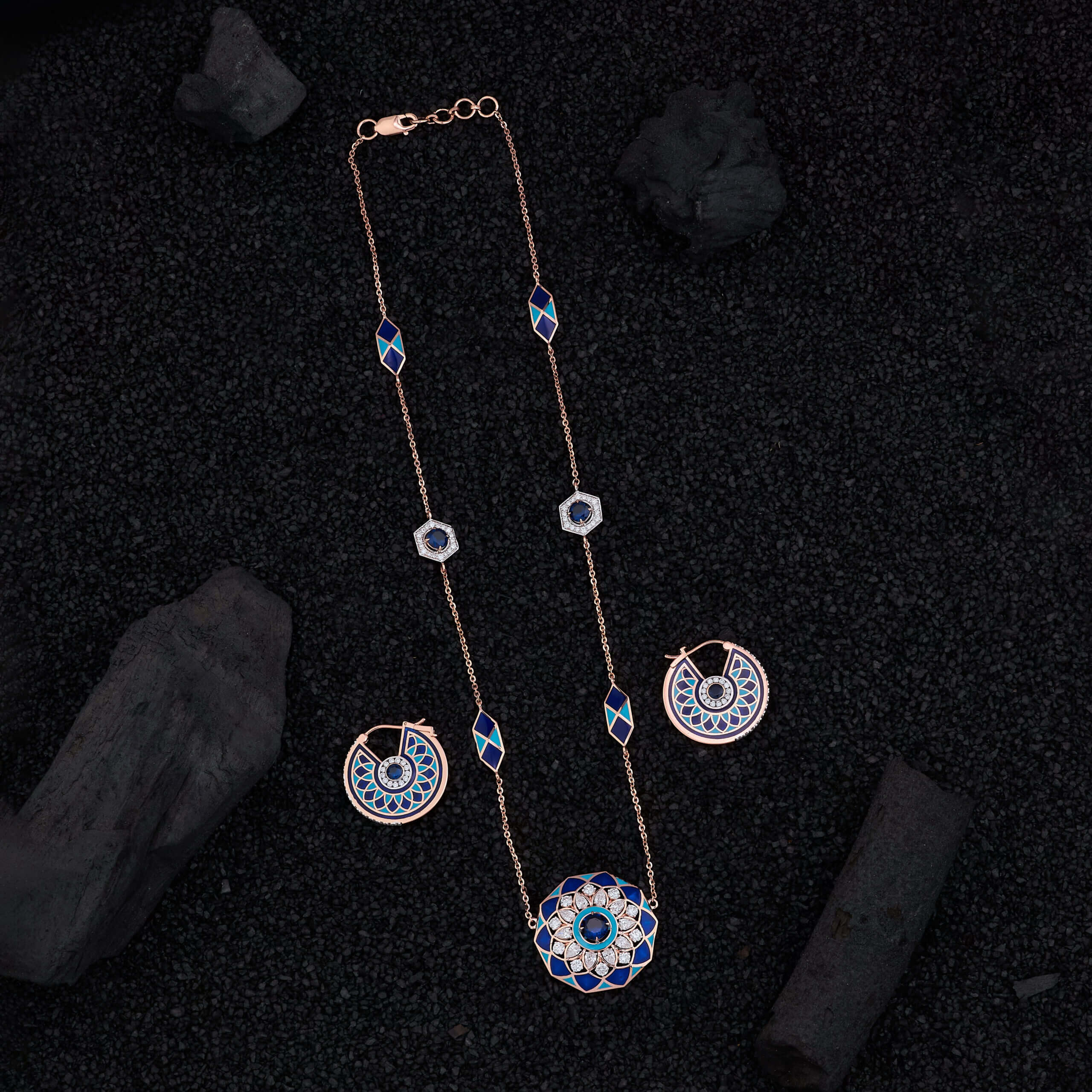 Inspired by the quiet poetry of the night sky and the symmetry found in nature, the Celestial Bloom Jewelry Set is a story told in sapphire blue, diamonds, and warm rose gold. Each element is thoughtfully placed, creating a rhythm of color and light that feels both calming and captivating.