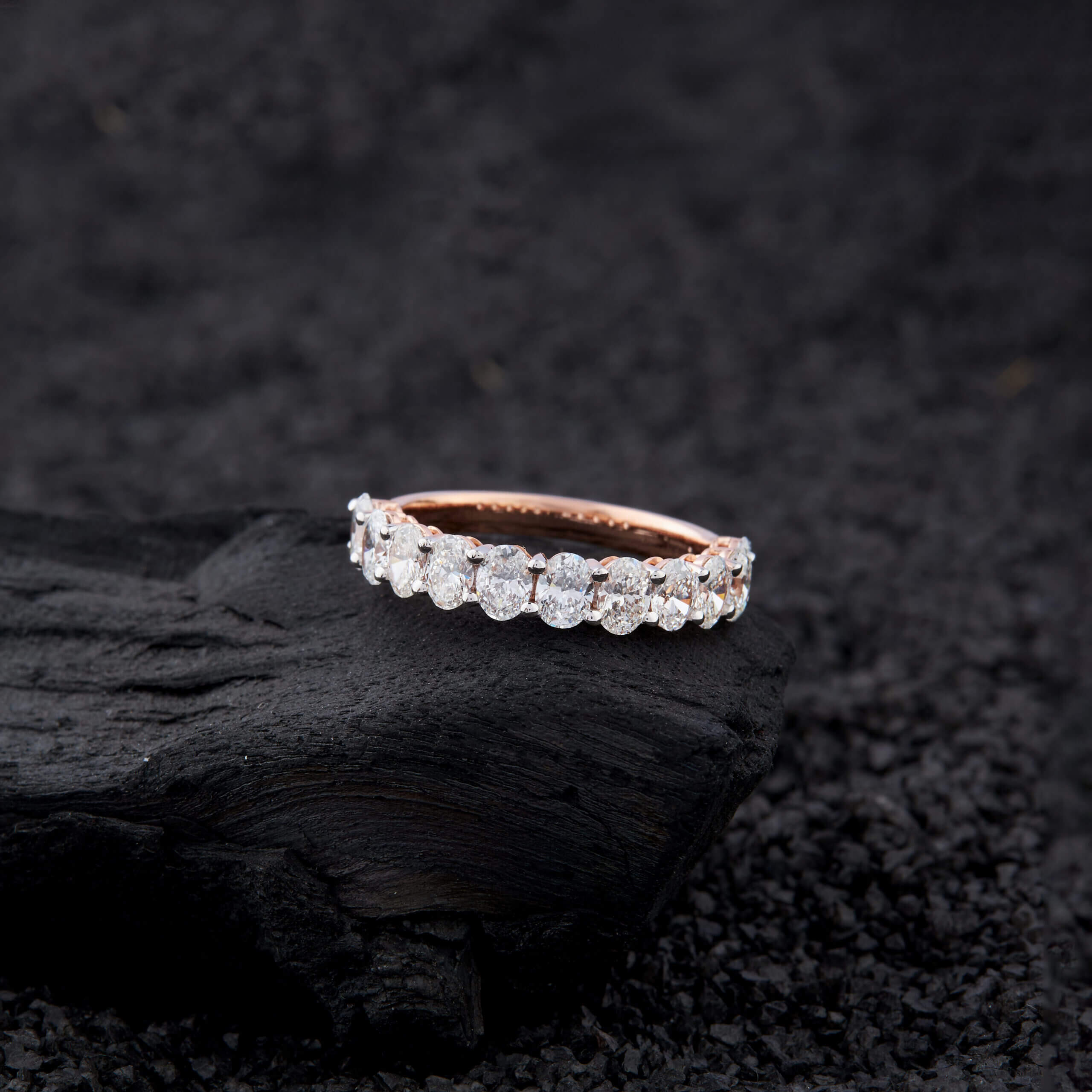 Softly radiant and endlessly meaningful, this oval diamond band is a celebration of continuity. Each oval-cut diamond flows into the next, creating a gentle rhythm of light that wraps effortlessly around the finger. Crafted in warm rose gold, the design feels intimate—never loud, always present.